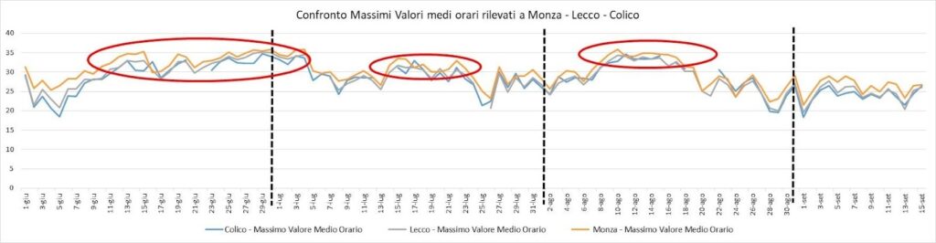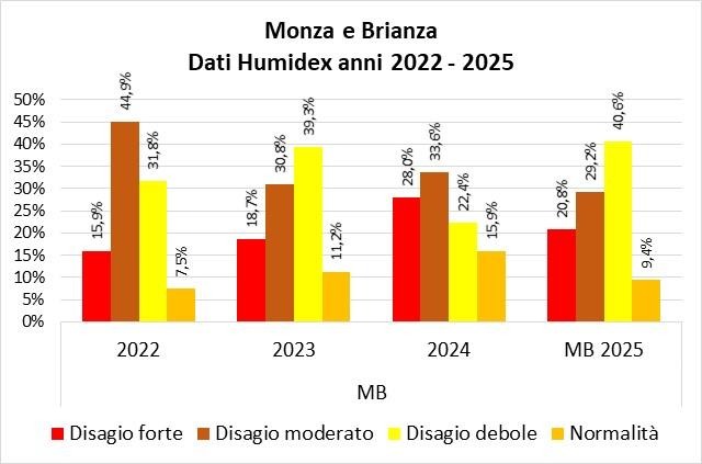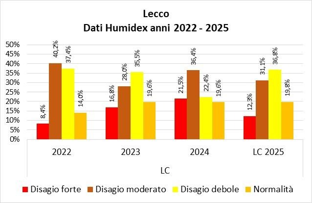 Il confronto dei dati Humidex relativi al quadriennio 2022-2025 mostra come il periodo estivo 2025 abbia di fatto costituito una inversione di tendenza rispetto ai dati osservati negli anni precedenti. Ciò è particolarmente evidente per quanto riguarda la percentuale di giornate con “Disagio Forte” che si riducono di nove punti percentuali nel territorio di Lecco (2024: 21,5% vs 2025: 12,3%) e di circa sette punti percentuali nel territorio di Monza e Brianza (2024: 28% vs 2025: 20,8%). In direzione opposta alla precedente si osserva invece, un deciso incremento del numero di giornate caratterizzate da disagio Debole. Mentre nel territorio di Monza e Brianza le giornate con “Disagio Debole” sono quasi raddoppiate rispetto al 2024 (2024: 22,4 vs 2025: 40,6%), nel territorio di Lecco registrano un aumento di circa il 14% (2024: 22,4% vs 2025: 36,8%)