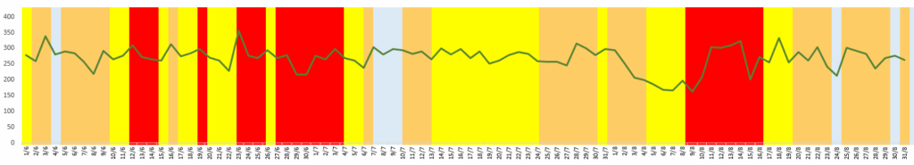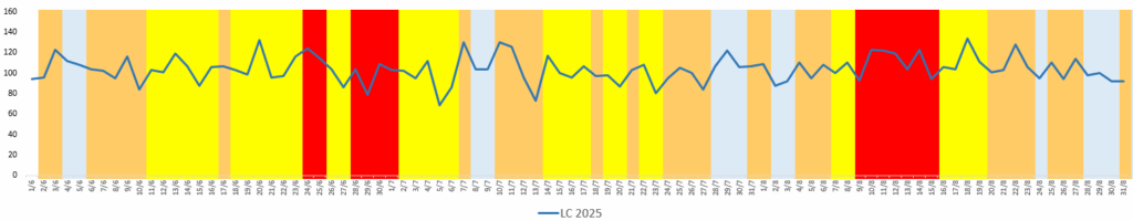 In ATS Brianza il Piano Caldo è coordinato dalla Struttura di Epidemiologia e il grafico sottostante mostra come, nel territorio di ATS Brianza il periodo estivo sembra essere stato segnato da un alternanza di periodi di intenso caldo seguiti da un clima leggermente più mite. Come è possibile osservare dal grafico relativo alle temperature massime un primo periodo di temperature elevate si è osservato tra il 12 giugno e il 4 luglio con temperature spesso superiori ai 30 gradi, con incrementi particolarmente marcati tra il 29 Giugno e i primi di Luglio (presenza di diverse giornate con massimi > 33°). E’ in questo stesso periodo che sono inviati due Alert al territorio (il 26/06/205 e il 01/07/2025).